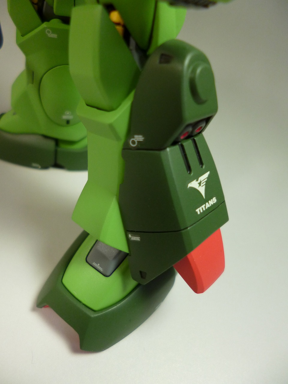 □頭部 モノアイスリットの形状をプラ板にて修正 モノアイ基部を市販バーニアパーツで別パーツ化し回転軸を追加 モノアイはHIQパーツのVCドームを使用 口のダクトの縁は削り込みで薄くシャープにし、スリットプラ板でディテールアップ □胴体 肩の接続軸をイカリ肩になるように角度と高さを変えて再接続 胸のセンサー部は彫り込んで薄くシャープに加工 ウエストの取り付け角度を変更、若干腰を入れたポーズに固定 貧弱に感じたウエストの動力パイプはコトブキヤのプラパイプを使用してディテールアップ □腕 前腕外側の動力パイプをガラスチューブとプラパイプで新造 基部はプラ板でディテールアップ シールドマウント用の穴は埋めています。 握り拳はバンダイビルダーズパーツの物を細かいディテールを埋めて使用 薄く感じた甲は1.2mmプラ板で厚く形状変更