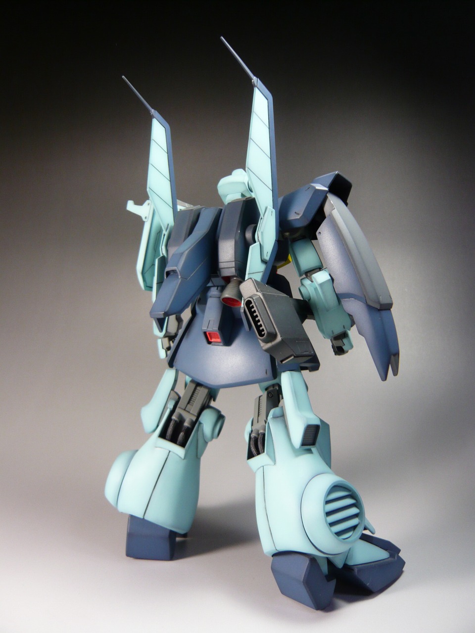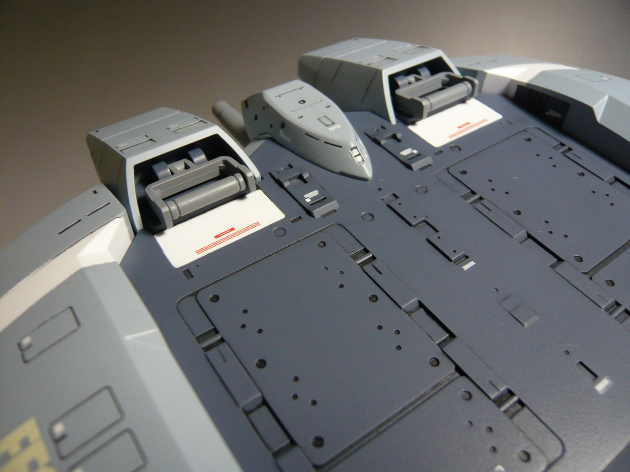 □股間軸を三分割、片側0.7mm両側で1.4mmの幅増し。 □太股上部の段差、プラ板を貼って4mmほど外装を延長して削除。 □リアアーマーの裏側が筒抜けだったのでプラ板で塞いでディテールアップ。 □くるぶし横のアーマーの先端をプラ板を接着してエッジの復元。 他、パネルラインの彫直し、エッジ処理をしています。