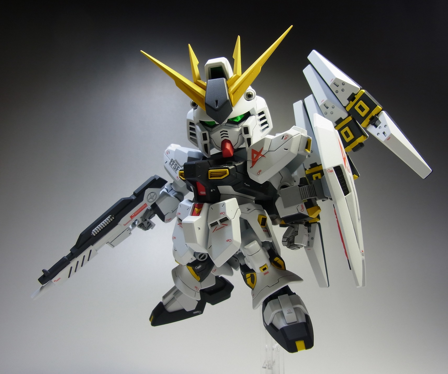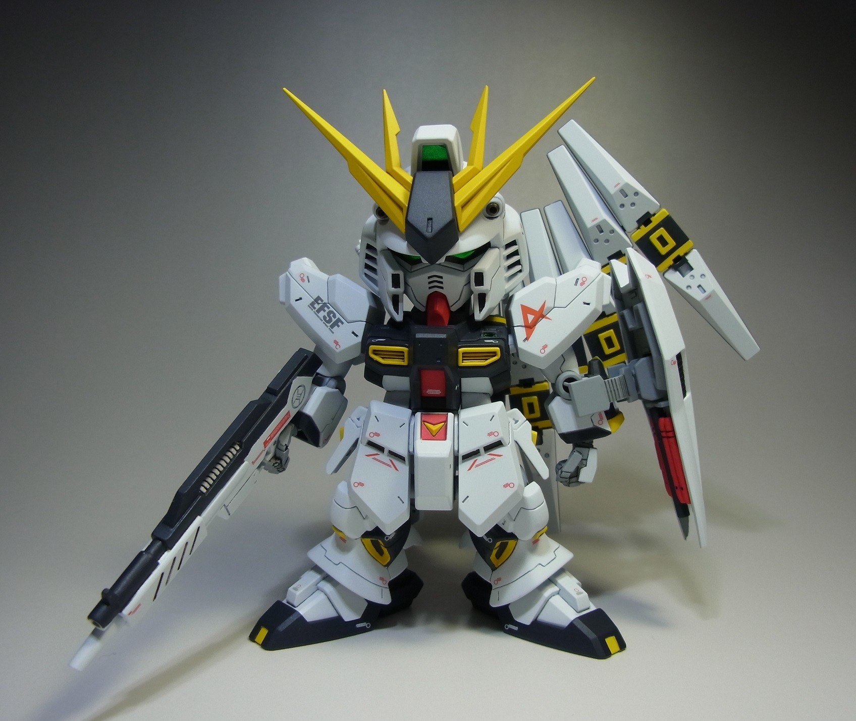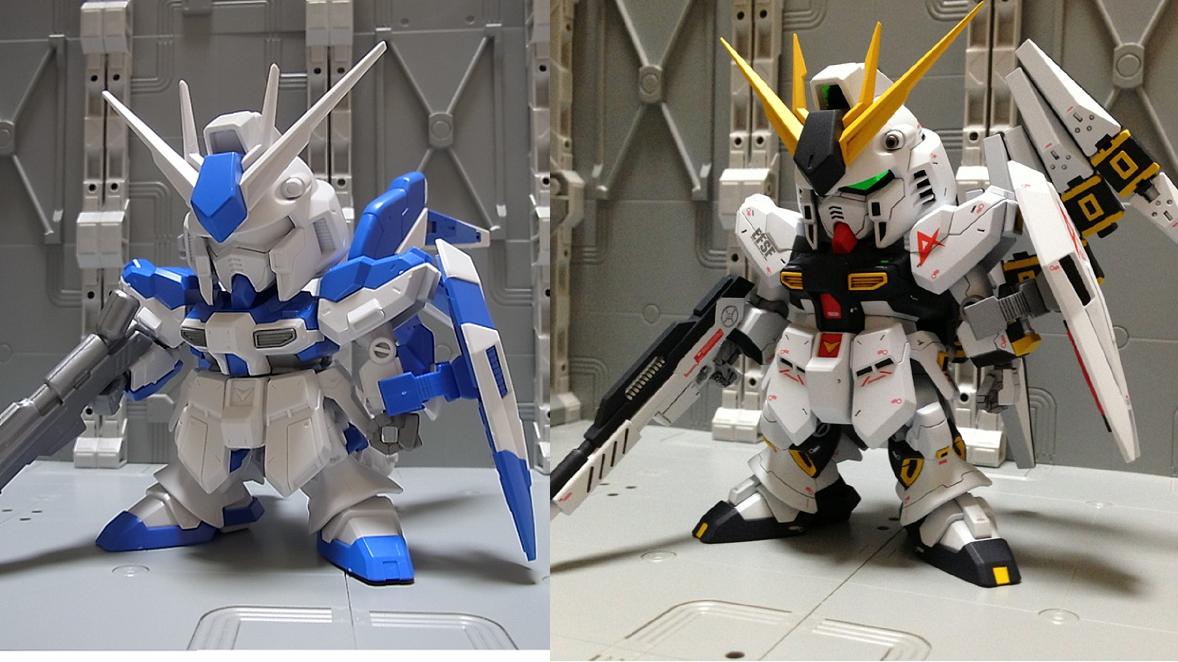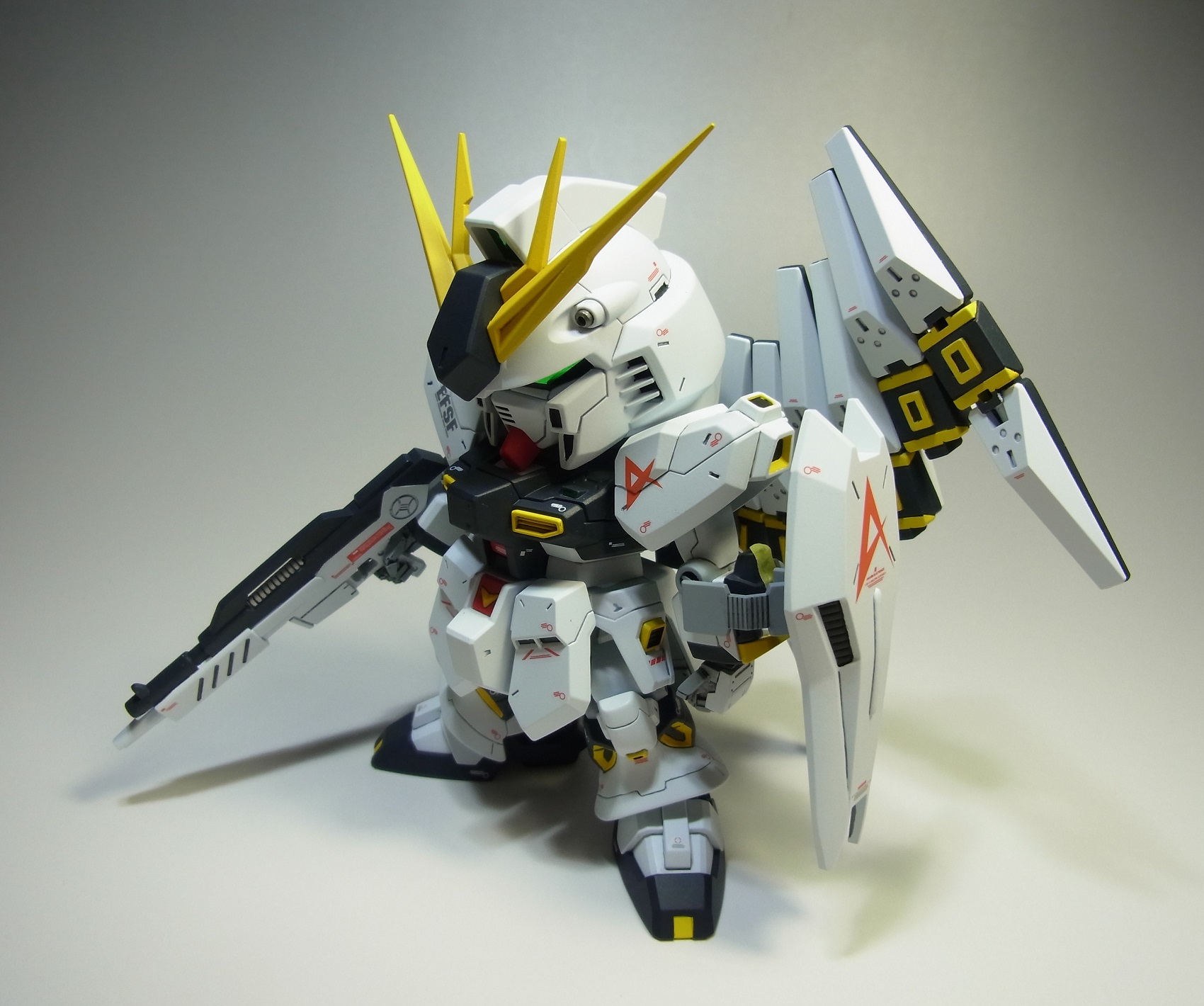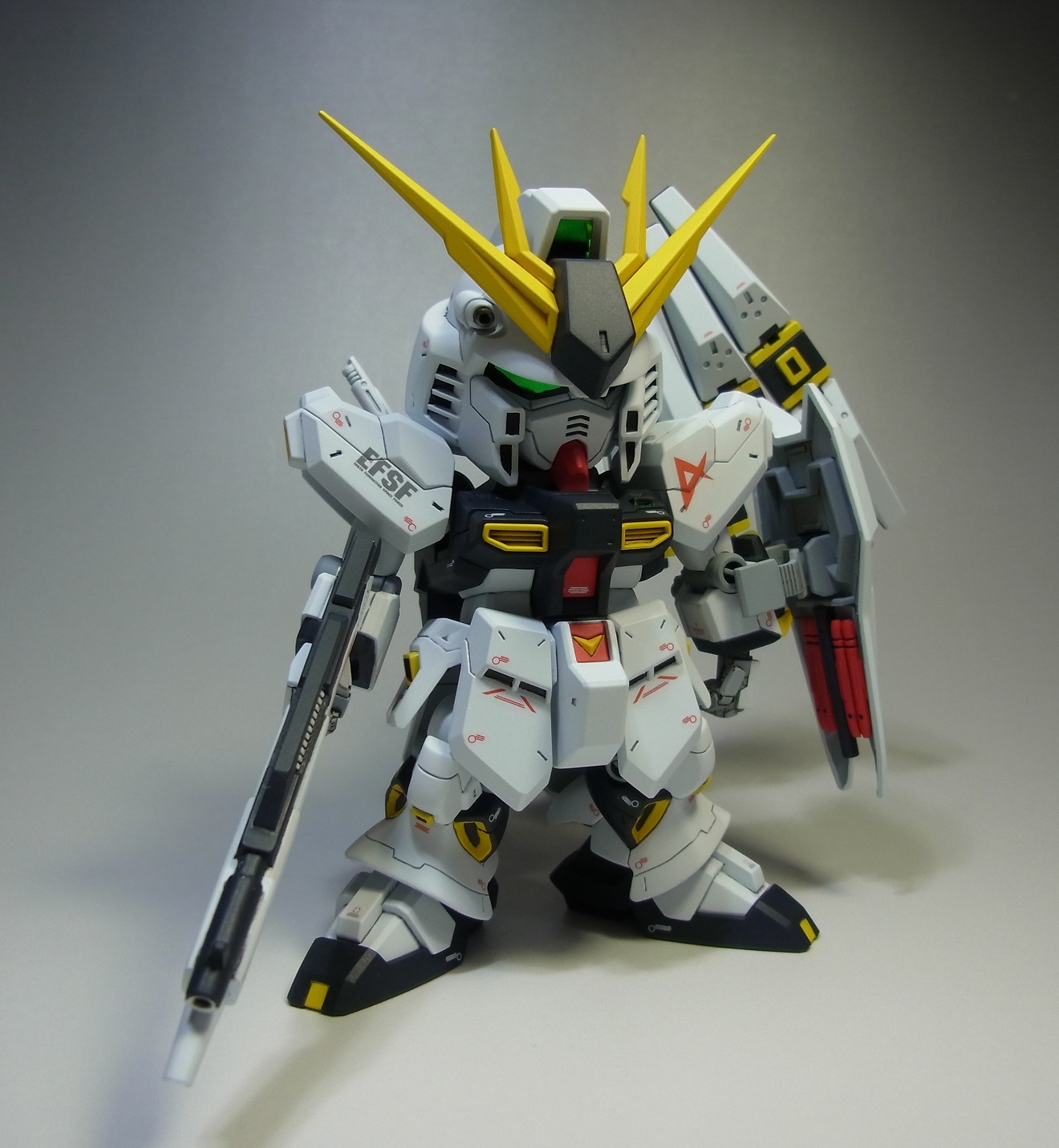 PR 2013.09.03 Tue 13:39:45 SD RX-93 νGUNDAMmusukeさん主催の「SD祭り」参戦用機体として 改修点 ◆胴体 ◆腕 ◆腰 ◆足 ◆バックパック ◆武装 ◆塗装 ◆デカール 表面処理などに手抜きの部分が見当たりますが言わなきゃ分からないでしょ~と シールドのAマークの下には赤い文字の配列を貼ってありますが、良く見ると「RX-0 UCガンダム」って書いてあります てな感じでツッコミ所満載ですが