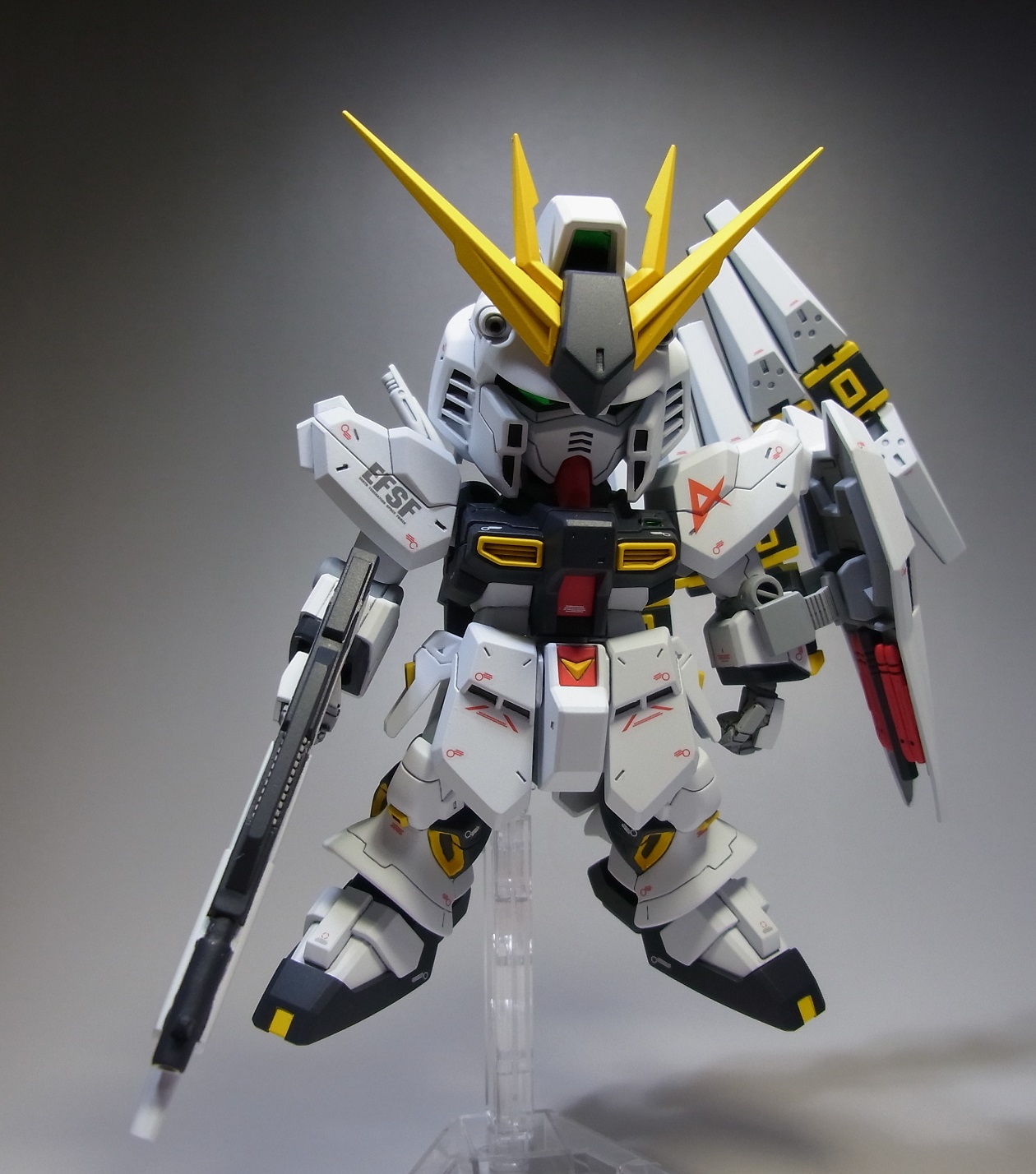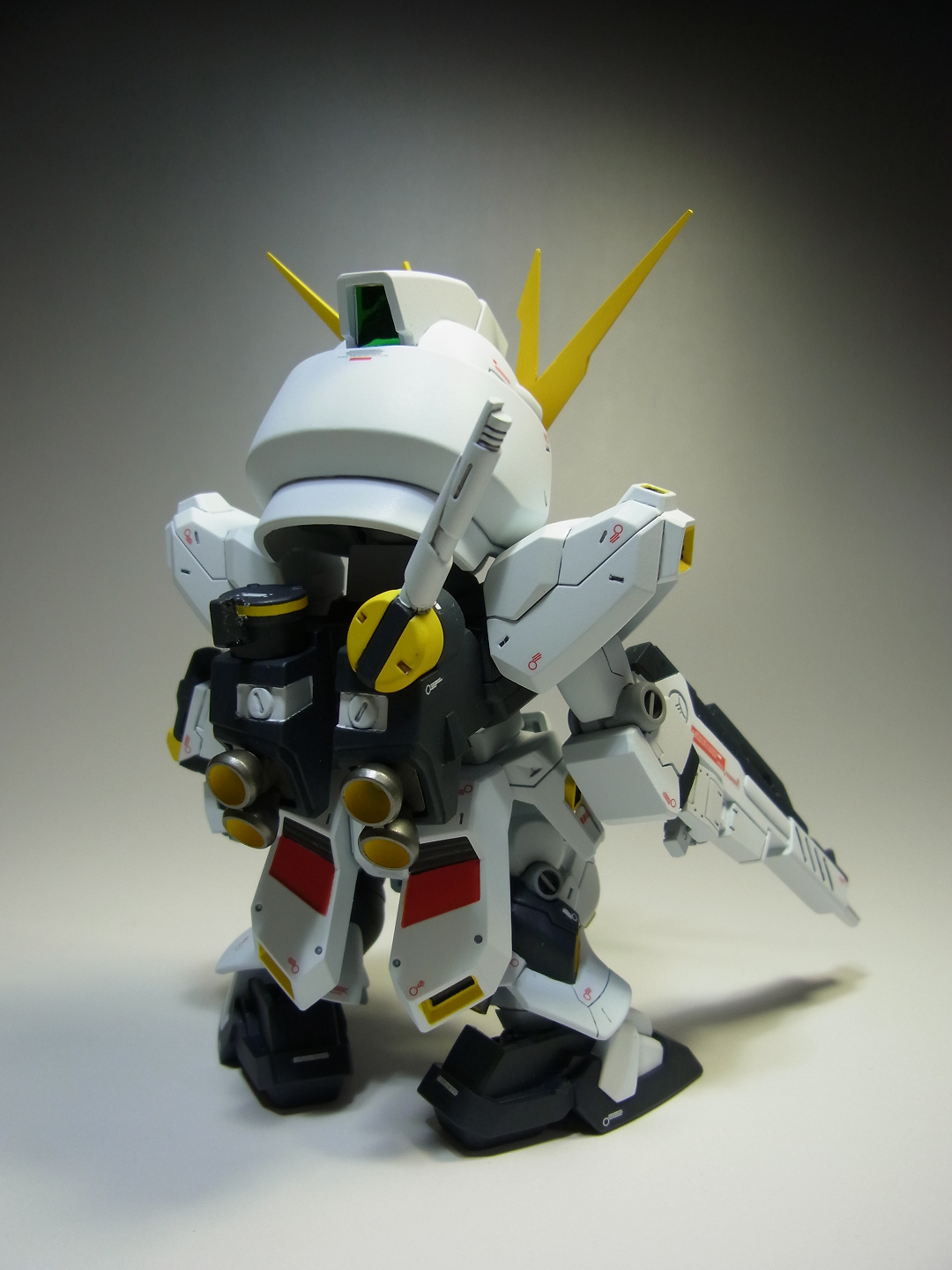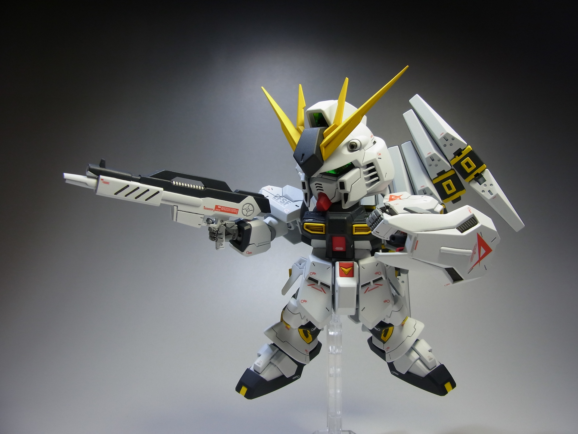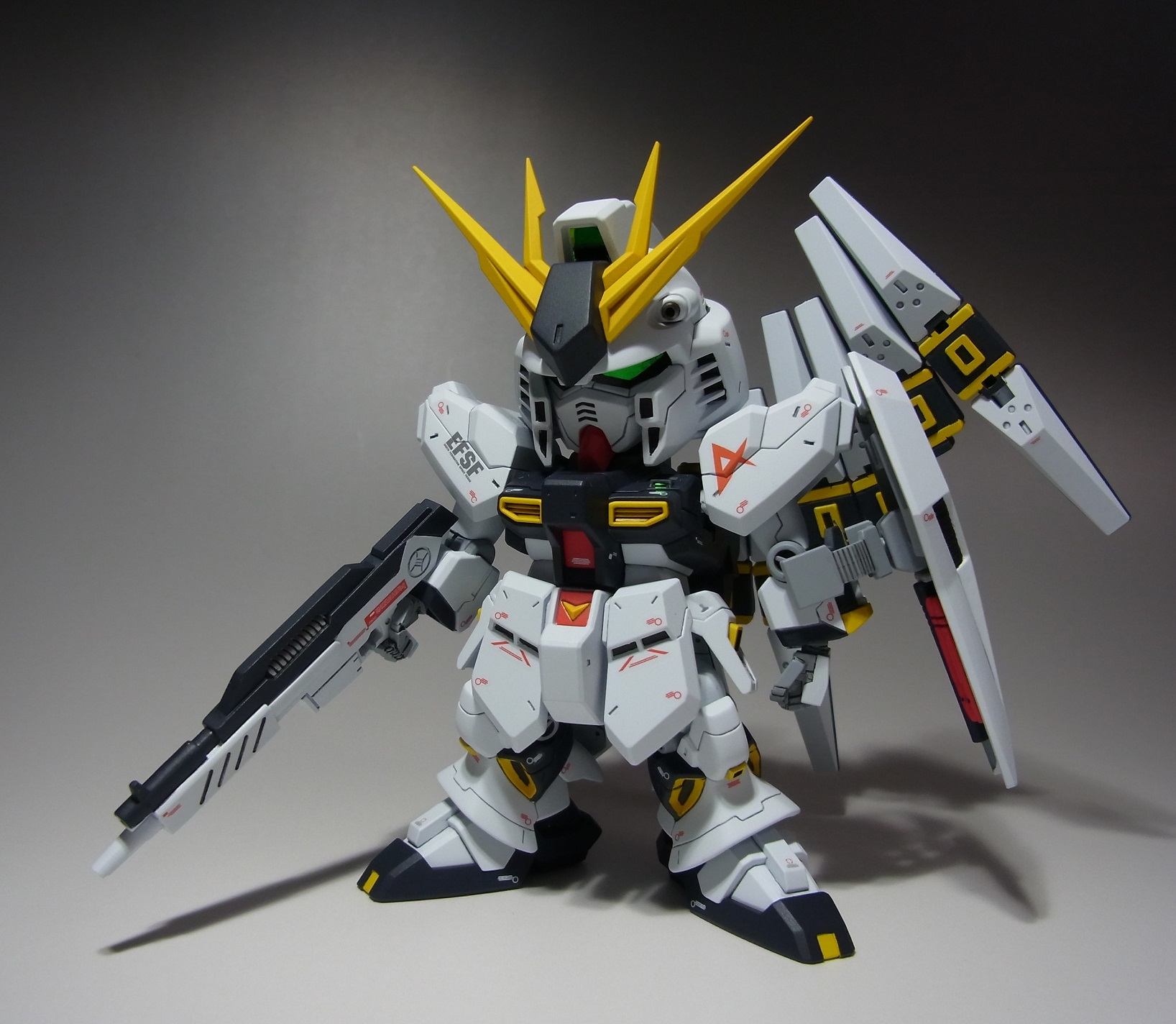 PR 2013.09.03 Tue 13:39:45 SD RX-93 νGUNDAMmusukeさん主催の「SD祭り」参戦用機体として 改修点 ◆胴体 ◆腕 ◆腰 ◆足 ◆バックパック ◆武装 ◆塗装 ◆デカール 表面処理などに手抜きの部分が見当たりますが言わなきゃ分からないでしょ~と シールドのAマークの下には赤い文字の配列を貼ってありますが、良く見ると「RX-0 UCガンダム」って書いてあります てな感じでツッコミ所満載ですが
