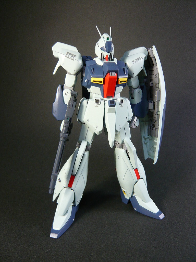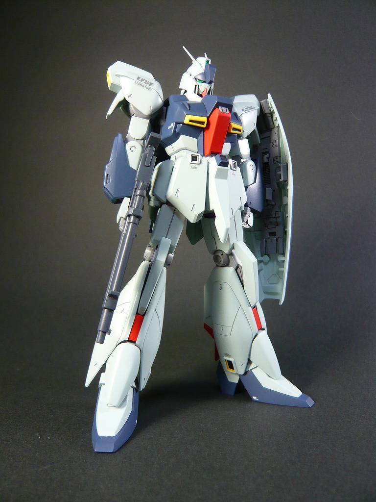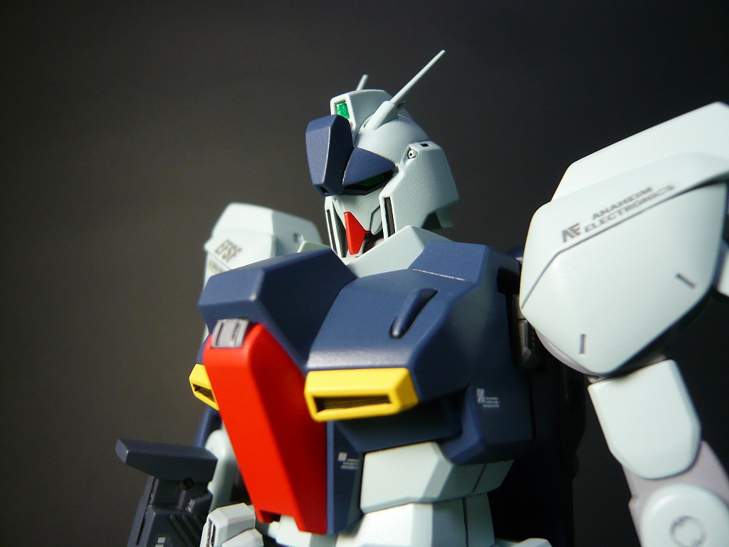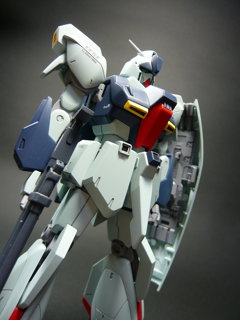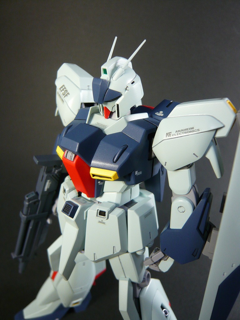 改修点 □頭部は顔を削り込み小顔化、取り付け位置を上に移動して目つきを悪く。 □胴体、襟パーツを削り込み胴体に埋め込み、コクピットハッチ上面のブロックをプラ板で2mmほどかさ上げ ウエストはプラスチックの肉厚ギリギリまで削り込み細身に。 □握り拳はHDMの複製品に交換 □腿はプラ板にて2mm延長、側面を片側0.5mm(計1.0mm)プラ板で太く修正、爪先はプラ板で1mm延長 □ビームライフルは抱え込む持ち方が気に入らなかったので、ストック位置を上下逆に移動、マズル位置を上方に移動 画像はクリックで拡大できます。